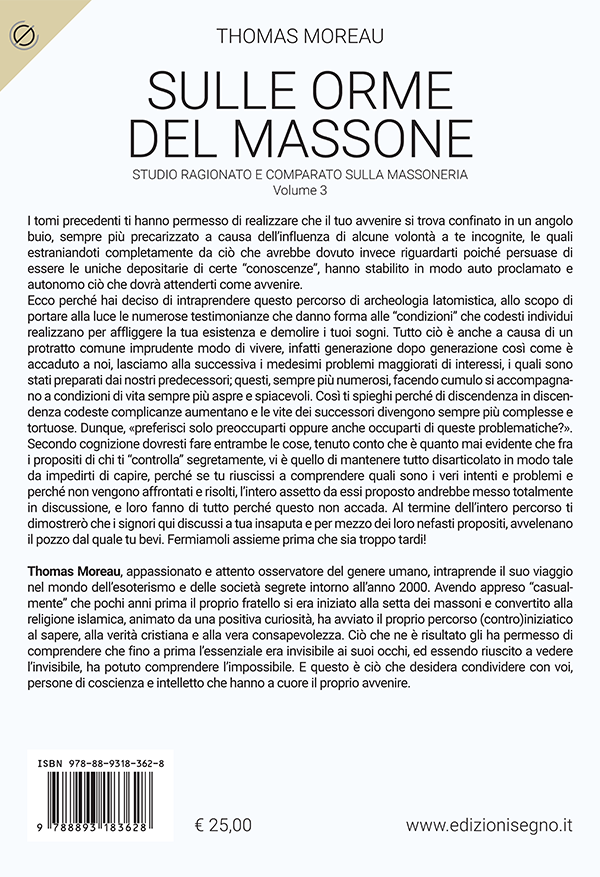 “Sulle orme del massone – Studio ragionato e comparato sulla Massoneria” è una collana letteraria strutturata in diversi tempi ed è frutto di una densa e sui generis esperienza personale dell’autore. Nessun contenuto è romanzato, nessuna teoria cospirativa viene proposta al lettore poiché di teorico in queste pagine non v’è nulla. Purtroppo.