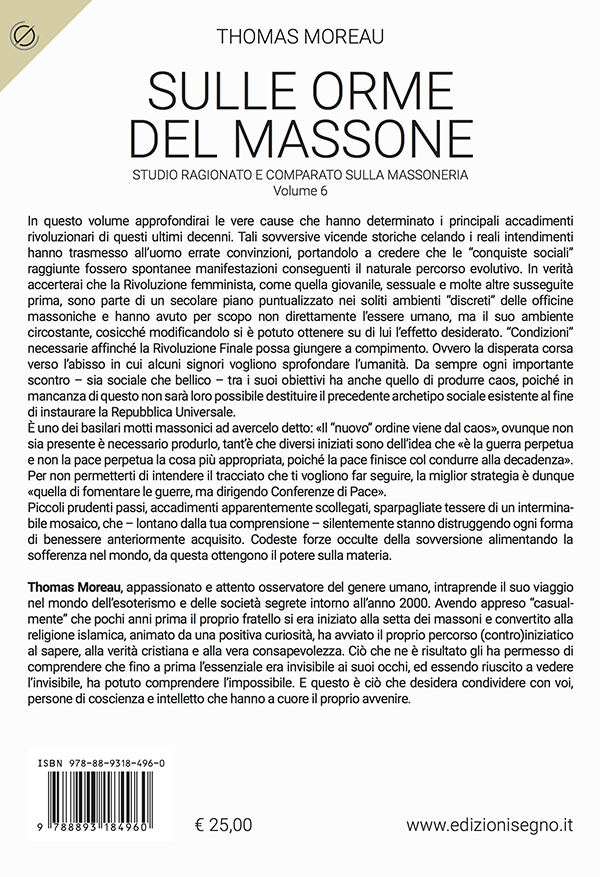 “Sulle orme del massone – Studio ragionato e comparato sulla Massoneria” è una collana letteraria strutturata in diversi tempi ed è frutto di una densa e sui generis esperienza personale dell’autore. Nessun contenuto è romanzato, nessuna teoria cospirativa viene proposta al lettore poiché di teorico in queste pagine non v’è nulla. Purtroppo.